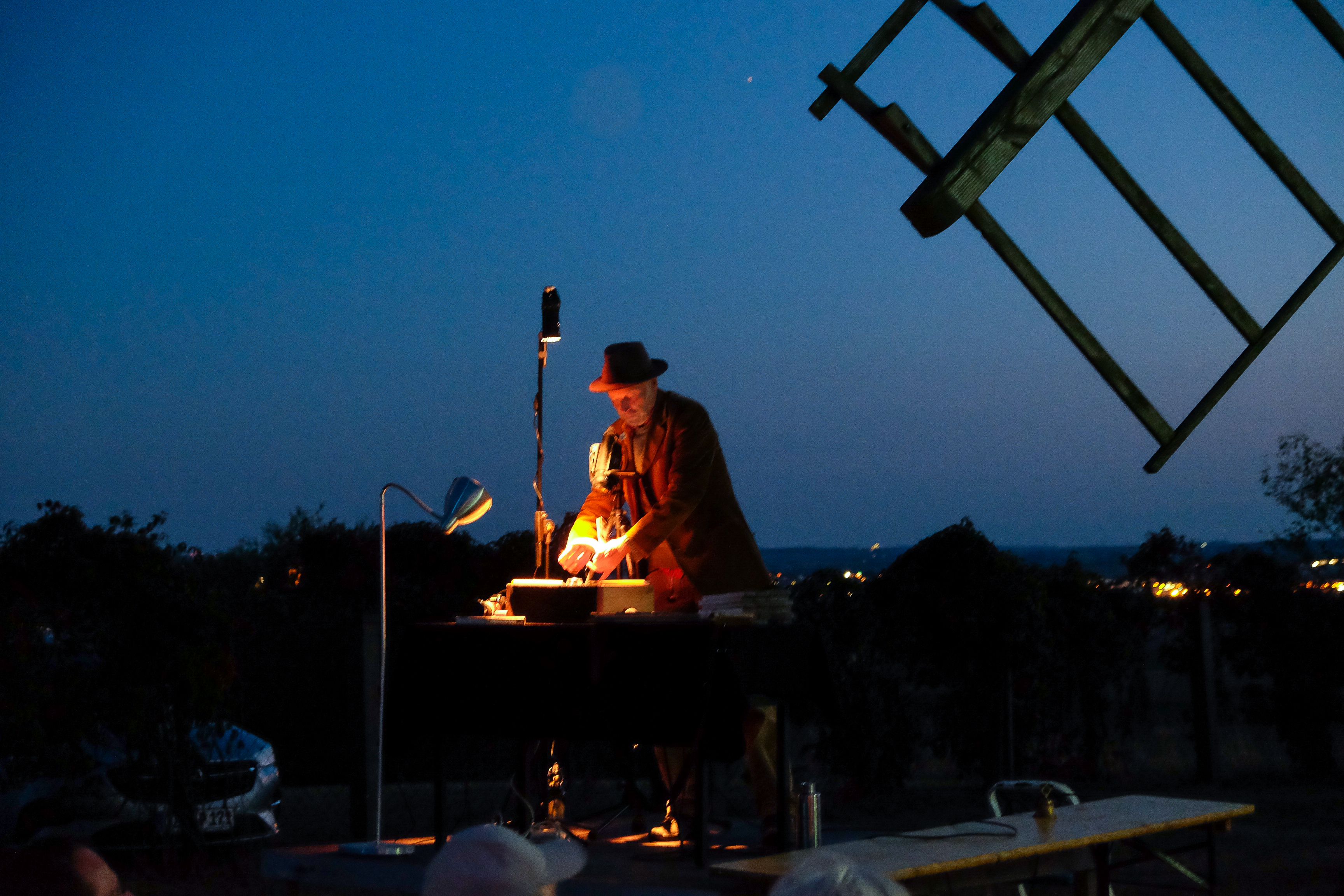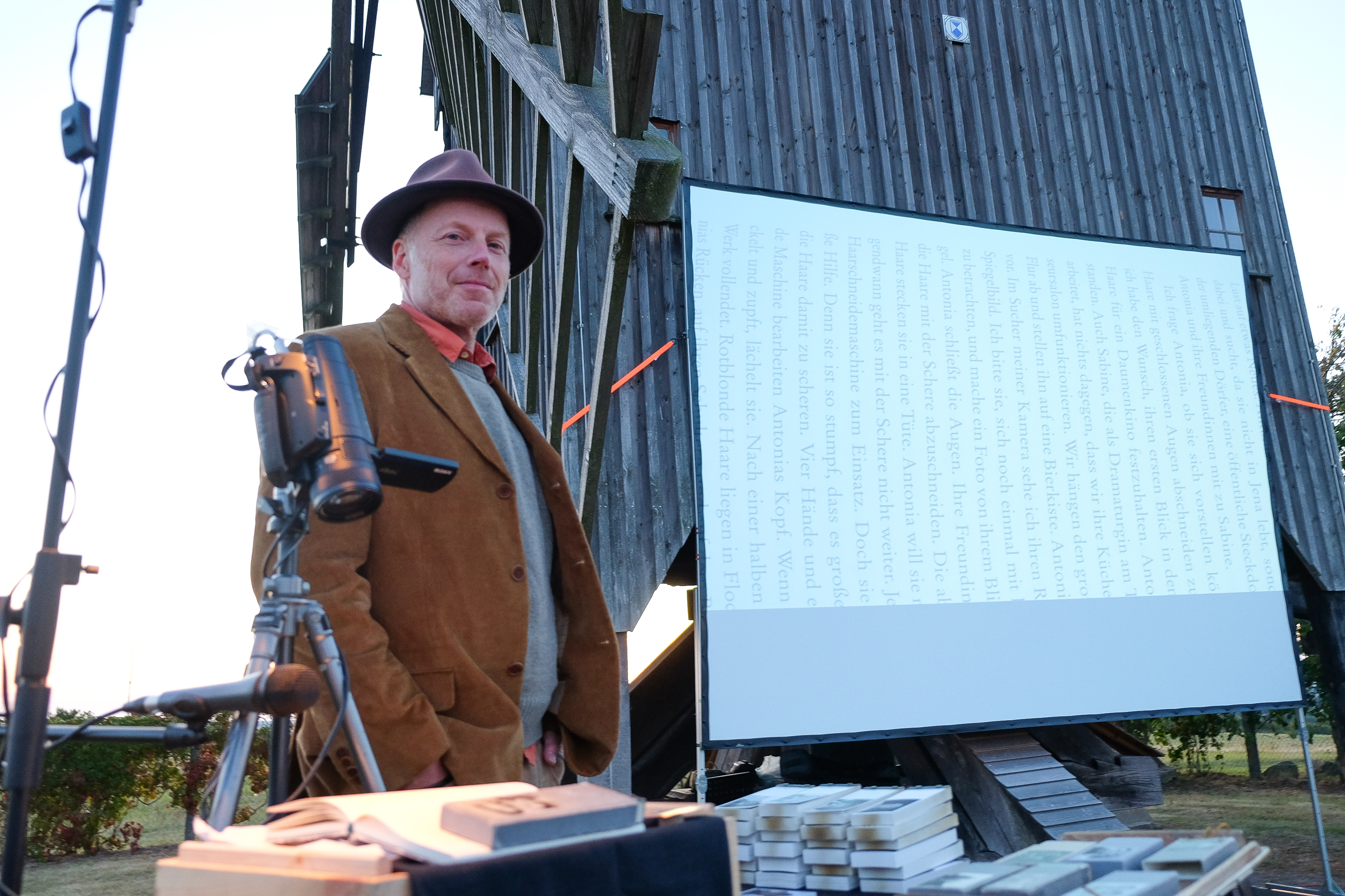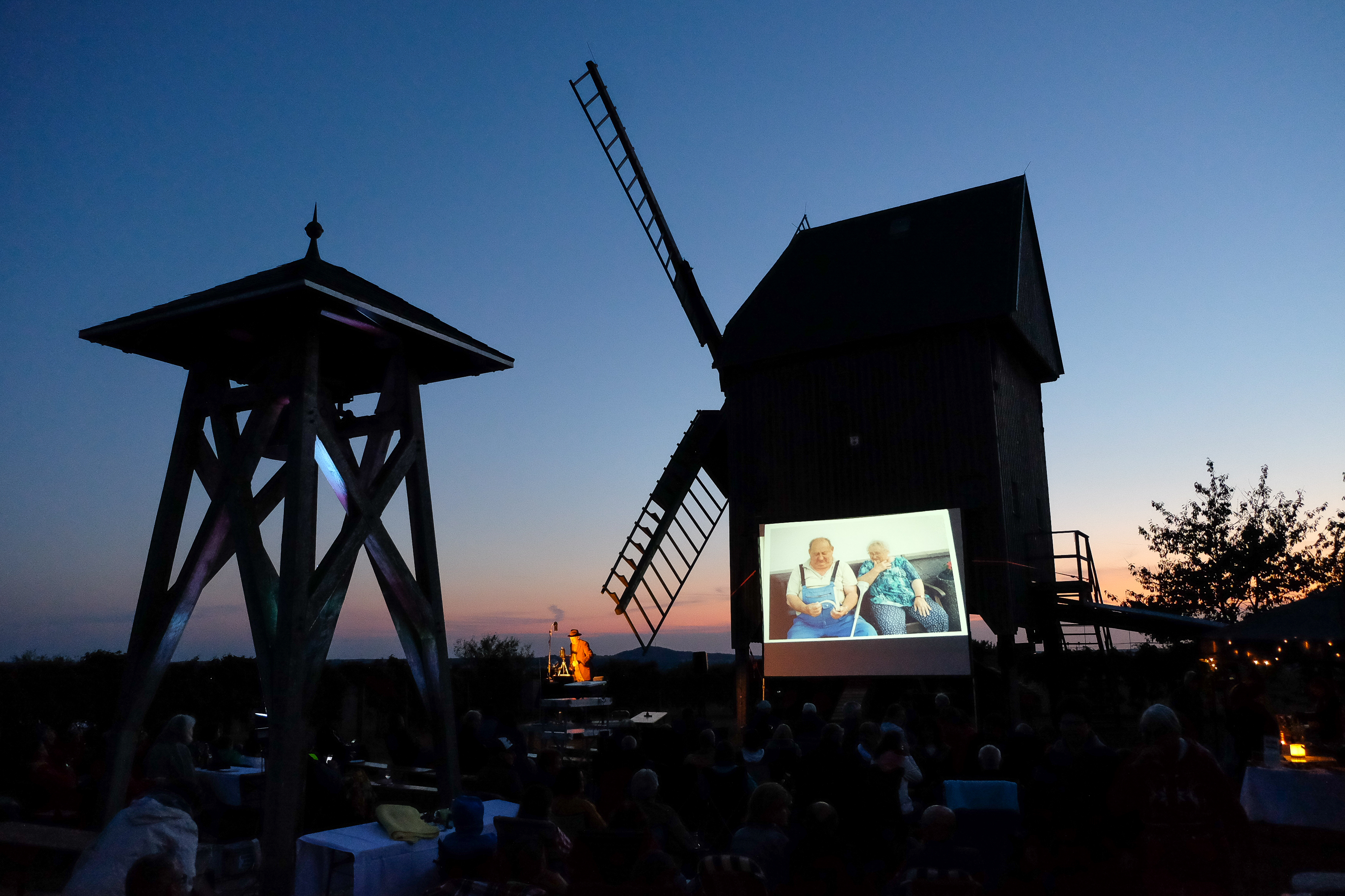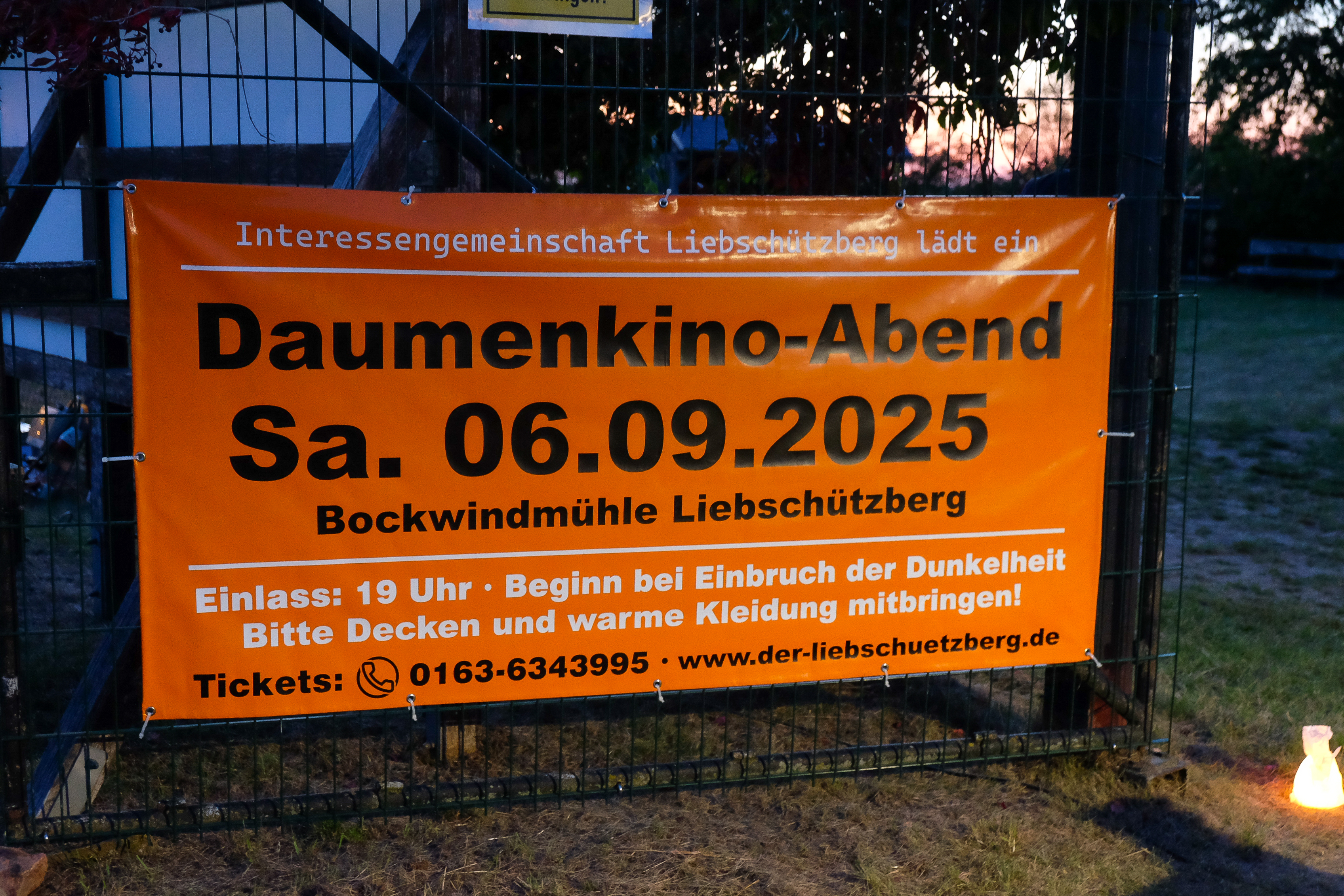 Ein Daumenkino-Kinoabend - was soll das denn bitte sein? Das hat sich vermutlich so mancher gefragt, als er die Ankündigung gelesen hat. Was genau soll daran unterhaltsam sein, sich Daumenkinos auf dem Liebschützberg anzuschauen? Ist das nicht eine alberne Kindersache? Daumenkinograph Volker Gerling gab darauf eine überzeugende Antwort und bewies uns das Gegenteil. Er präsentierte sein Programm "Bilder lernen laufen, indem man sie herumträgt", mit dem er die bekanntesten Bühnen der deutschsprachigen Kleinkunstszene bespielt. Es dauerte nicht lange, dann waren die letzten Gespräche am Glockenturm neben der Windmühle verstummt, und die zahlreich erschienenen Gäste verfolgten gebannt, wie Volker Gerling behutsam seine Daumenkino abblätterte. Doch wie entsteht überhaupt solch ein Daumenkino? Volker Gerling ist in den letzten zwei Jahrzehnten mehr als 5000 Kilometer zu Fuß durch Deutschland, Österreich und die Schweiz gelaufen. Auf seinen Wegen traf er Menschen, die ihm Geschichten aus ihrem Leben erzählten. Mit einer analogen Kamera porträtierte er diese für seine Daumenkinos. Sei es ein alter Mann, der schon fünf politische Systeme erlebt hat. Oder zwei Künstler, die sich nachts dem Rotwein hingeben. Oder ein "Pärchen zu dritt", das neue Wege in der Liebe ausprobiert. Oder zwei reglos sitzende Jungs am Ufer eines Sees, die beim Angeln scheinbar einfach ihre Ruhe haben wollten. Mit 36 Bildern eines Kleinbildfilms kann man eine Menge erzählen, auch wenn die Begegnung manchmal nur kurz ist. Oft sind in den Daumenkinos Menschen mit überraschenden Reaktionen zu sehen - Gesichter, die in den nur wenige Sekunden langen Sequenzen vielleicht mehr aussagen als manch langer Kinofilm. Bei seinen Wanderungen trägt Volker Gerling die Daumenkinos in einem Bauchladen herum und zeigt sie interessierten Menschen. Er bringt sie damit zum Lachen und nicht selten auch zum Weinen. Auf dem Liebschützberg konnten die Zuschauer gemeinsam diese spezielle Kunstform bewundern. Das Abblättern der Daumenkinos haben wir auf eine Großbildleinwand projiziert, die direkt an der Windmühle lehnte. Jedes Daumenkino wurde jeweils drei Mal gezeigt, so dass man es genau anschauen und verinnerlichen konnte. Volker Gerlings humorvolle,dabei aber auch nachdenklich-tiefgründige Ausführungen machten klar, dass das Leben bunt und vielfältig ist, und dass sich hinter jeder noch so zufälligen Begegnung eine spannende Geschichte verbergen kann. Im Karée an der Mühle ergab sich ein wunderbares Bild, das man so noch nicht gesehen hat. Der bezaubernde Sommerabend mit fast vollem Mond und Sternenhimmel tat sein Übriges zur ganz besonderen Stimmung. Wir von der IG Liebschützberg haben diese Veranstaltung als eine Sternstunde auf dem Liebschützberg empfunden. Passenderweise beendete Volker Gerling seinen Daumenkino-Abend mit einer berührenden Geschichte über Sterne. Danach war keine Zugabe nötig.Fazit: Der Daumenkino war keineswegs albern, und keine einzige Minute langweilig!