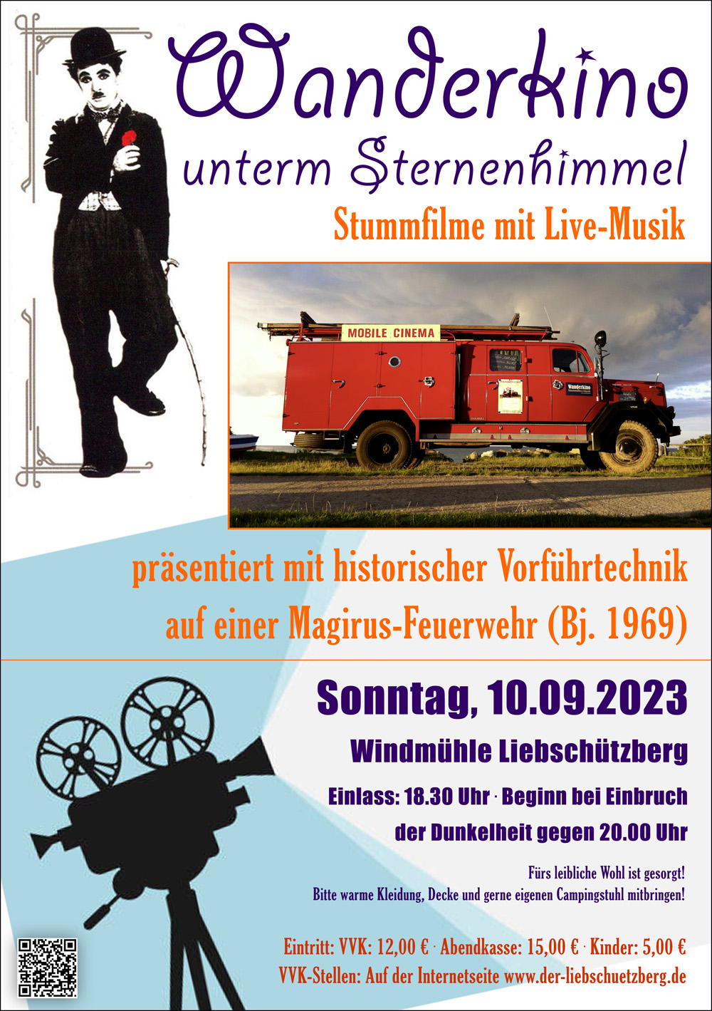 Wir veranstalten einen Open-Air-Kinoabend mit dem Wanderkino von Tobias Rank! (www.wanderkino.de). Ganz in der Tradition des guten alten Landfilms werden Stummfilme von Buster Keaton, Charlie Chaplin und Laurel & Hardy zu sehen sein, die durch Live-Musik auf Klavier und Violine begleitet werden. Star des Abends wird die historische Megirus-Deutz-Feuerwehr Baujahr 1969 sein, die zum mobilen Kino umgebaut wurde, und die während der Veranstaltung besichtigt werden kann. Es erwartet uns ein faszinierender Abend, der Jung und Alt ein Lächeln ins Gesicht zaubern wird! Gezeigt werden Stummfilme von Buster Keaton und Charlie Chaplin, begleitet mit Live-Musik von Tobias Rank (Klavier) und Izabela Kalduńska (Violine). Beginn ist bei Einbruch der Dunkelheit gegen 20.00 Uhr.